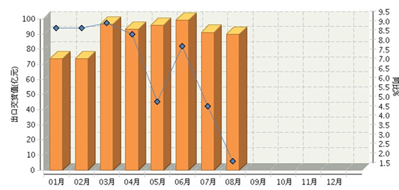2014年8月全国食品行业累计出口交货值同比增长5.22%