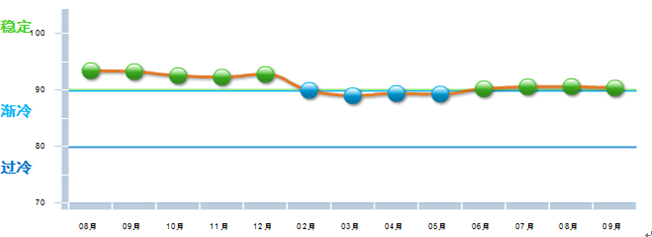 图1-3 2013年8月~2014年9月食品行业主营收入景气指数变化态势