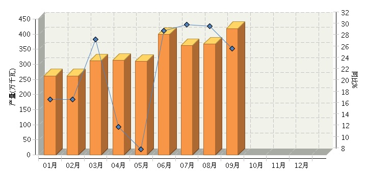 根据国家统计局公布数据,全国太阳能电池行业累计完成产量3,382.47万千瓦,同比增长27.30%。其中:9月份完成产量418.53万千瓦,同比增长26.74%。2014年全国太阳能电池行业月度产量及同比如下图所示。