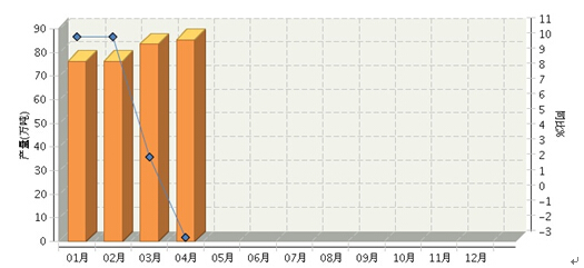 根据国家统计局公布数据, 2015年1月~4月,全国规模以上罐头企业累计完成产量321.12万吨,同比增长1.04%。其中:1月份完成产量76.22万吨,同比增长10.47%;2月份完成产量76.22万吨,同比增长10.47%;3月份完成产量83.43万吨,同比增长2.53%;4月份完成产量85.34万吨,同比增长-2.74%。2015年月度数据走势及同比增长情况如下图所示。