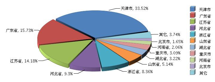 从主产区看, 天津市累计出口交货值14.24亿元(占33.52%),同比增长14.12%;广东省累计出口交货值6.68亿元(占15.73%),同比增长5.13%;江苏省累计出口交货值6.02亿元(占14.18%),同比增长13.21%。