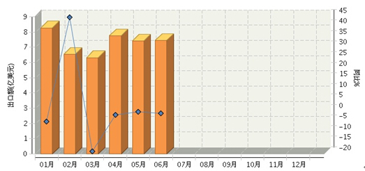 2015年1~6月,全国食品行业累计完成出口额43.69亿美元,同比下降0.09%。其中:1月份完成出口额8.27亿美元,同比下降4.66%;2月份出口6.52亿美元,同比增长44.63%;3月份出口6.31亿美元,同比下降18.71%;4月份出口7.75亿美元,同比下降1.54%;5月份出口7.41亿美元,同比下降0.1%;6月份出口7.44亿美元,同比下降0.74%。从各月份出口情况来看,除2月份出口高速增长外,其他月份均为负增长。