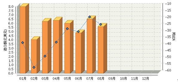 根据国家海关公布数据,2015年1月~8月,全国食品行业累计完成进口额47.58亿美元,同比增长-35.51%。其中:1月份完成进口额8亿美元,同比增长-37.05%;2月份完成进口额4.04亿美元,同比增长-55.57%;3月份完成进口额6.23亿美元,同比增长-47.16%;4月份完成进口额6.36亿美元,同比增长-36.62%;5月份完成进口额5.99亿美元,同比增长-26.5%;6月份完成进口额4.85亿美元,同比增长-28.72%;7月份完成进口额6.5亿美元,同比增长-17.65%;8月份完成进口额5.6亿美元,同比增长-23.3%。2015年月度数据走势及同比增长情况如下图所示。
