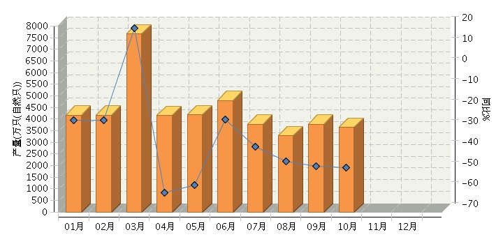 根据国家统计局公布数据,2015年1~10月全国碱性蓄电池行业累计完成产量同比增长-29.64%。其中:10月份完成产量同比增长-48.33%。2015年全国碱性蓄电池行业月度产量及同比如下图所示。
