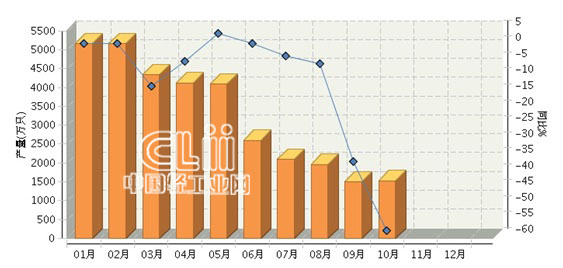 2015年1~10月,湖北白炽灯泡累计完成产量32549.00万只,同比增长-9.97%。其中: 10月份完成产量1526万只,同比增长-57.61%。