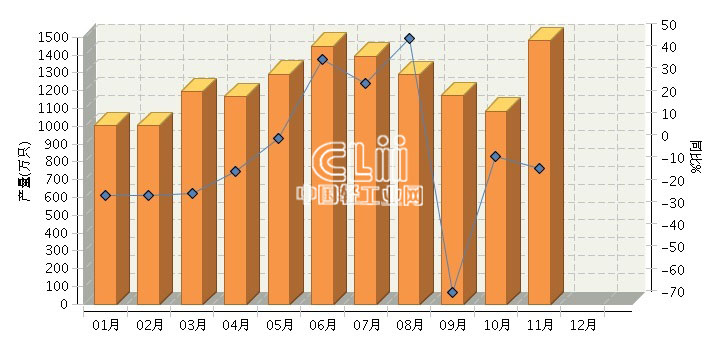 2015年1月~11月,广东荧光灯行业累计完成产量17,969.80万只,同比增长-11.81%。其中: 11月份完成产量1482.62万只,同比增长-9.1%。