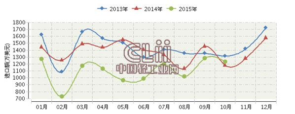 2015年全国灯具及照明装置零件行业连续三年月度进口额对比