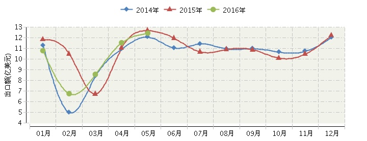 全国文教办公用品连续三年月度出口额对比