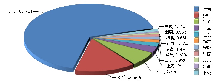 2016年1月~12月全国玩具行业累计出口额地区占比情况