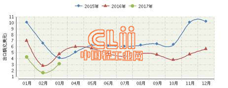 据海关数据显示,2017年一季度我国陶瓷砖出口量价继续回落,其中出口额下降幅度依然高于出口量降幅。据海关数据显示,2017年1~3月我国陶瓷砖累计出口金额9.12亿美元,同比下降38.22%;出口量1.83亿平方米,同比下降11.40%。从连续三年月度出口额对比情况看,2017年一季度各月出口额均低于上两年水平。