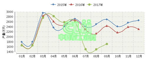 2017年1~9月,安徽荧光灯累计产量18,845.86万只,同比增长-9.32%。其中: 9月份完成产量1715.33万只,同比增长-29.64%。