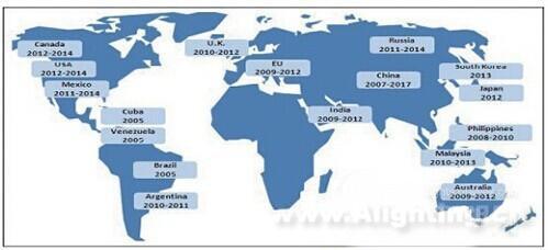 笔者整理的各国“禁白”时间表表明,2014年,部分国家禁售60W与40W白炽灯执行进入实质性阶段,如2014年1月1日起,美国禁售40W以上白炽灯;10月1日起,中国将禁止进口和销售60W及以上的普通照明用白炽灯;巴西将对40W白炽灯进行管制;俄罗斯、澳大利亚和韩国同样将限制白炽灯的使用,而欧洲与日本2012年起已开始全面停止使用白炽灯。这对LED照明来说无疑是一重大利好。