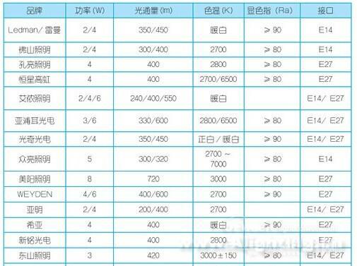 表3是部分在淘宝销售的LED灯丝灯产品及光电参数,目前灯丝灯的平均光效已超过100lm/W,光色有暖白、正白、冷白可选,并且灯座接口为E14或者E27,因此可直接替换白炽灯。