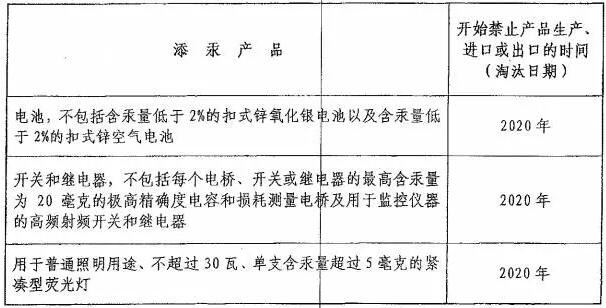 环境保护部环境保护对外合作中心副主任余立风在新闻发布会上公布了中国的履约时间表:从2021年起,中国将淘汰《关于汞的水俣公约》要求的含汞电池、荧光灯产品的生产和使用;VCM(氯乙烯,会产生含汞废水)生产行业实现单位产品的使用量在2021年降低50%(2010年的基础上);到2032年,要关停所有原生汞矿的开采;针对燃煤电场的排放源,到2020年完成排放编制,明确重点管控来源,确定减排目标和措施。