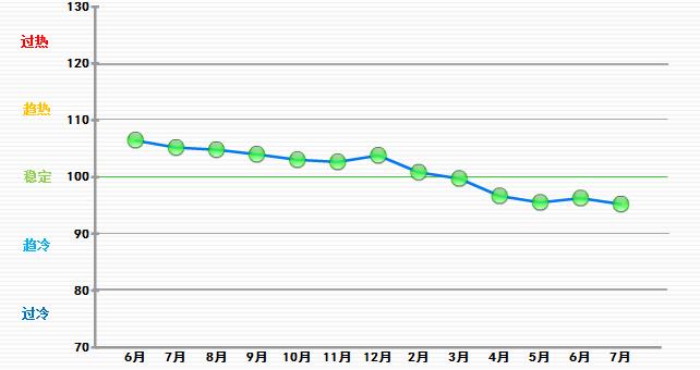 7月份中轻景气指数为95.24,位于“稳定”区域(参见图1-1)。与6月份相比,中轻景气指数略有下降,下降1.25。