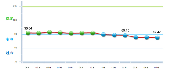 2015年5月中轻景气指数为87.47,较上月小幅下降0.18。中国轻工业经济运行及预测预警系统数据显示,近三年中轻景气指数呈现阶梯式下落走势。轻工月度景气指数已连续两年低于100,2014年该指数自年初以来在稳定区间底部徘徊。该指数自去年11月首次跌入渐冷区间以来,本月已经是连续第六个月运行在渐冷区间。