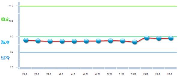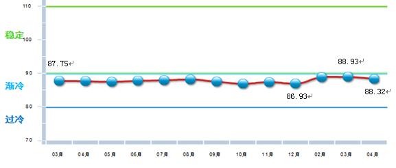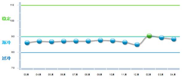 食品行业景气指数本年较去年回升,前4月均在渐冷区间顶部平稳运行。4月,行业景气度景气指数88.98,较上月微升0.12点。