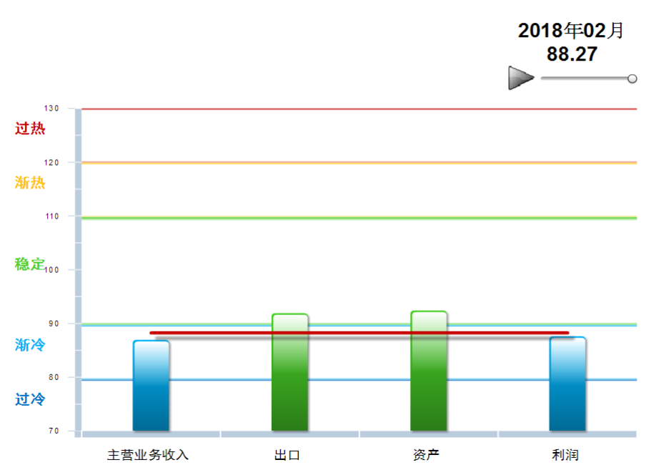 从分项指数看,资产景气指数最高,92.40点;其次,出口景气指数91.93点;主营业务收入及利润景气指数均在蓝色渐冷区间,分别为86.96点和87.63点;与去年年末对比,主营业务收入景气指数下降0.23点,利润景气指数回升4.38点;出口景气指数下降1.07点,资产景气指数上升2.86点。