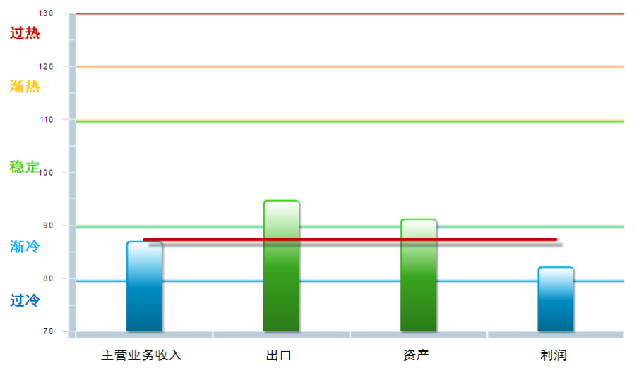 从分项指数看,出口景气度有较明显回升,其他三项分项指数均环比上月下降,其中:主营业务收入景气指数87.09,位于“渐冷”区间,较上月下降0.37点;出口景气指数为94.82,位于“稳定”区间,较上月回升4.75点;资产景气指数为91.34,位于“稳定”区间,较上月下降1.01点;利润景气指数82.26,位于“渐冷”区间,较上月下降2.73点。