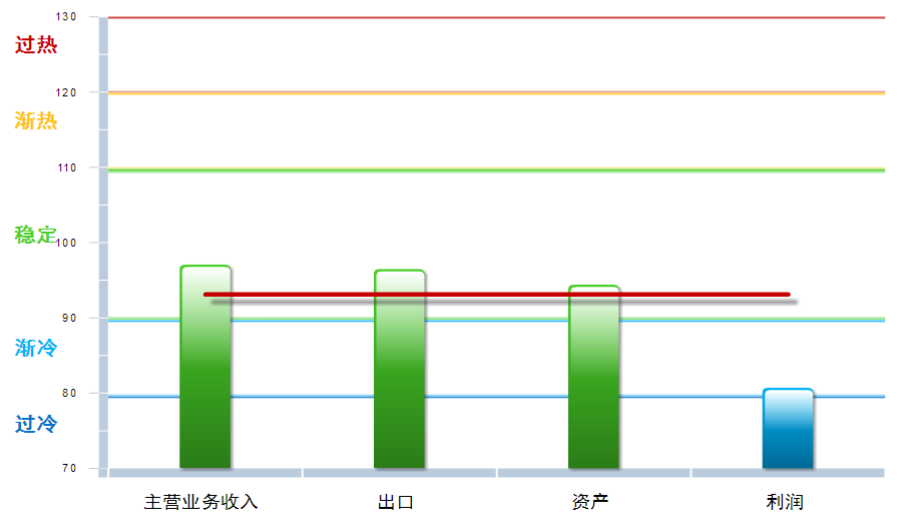 从分项指数看,出资产景气指数环比小幅下降外,其他三项分项指数均有回升,其他三项分项指数均环比上月下降,其中:主营业务收入景气指数97.06,位于“稳定”区间,较上月上升0.98点;出口景气指数为96.46,位于“稳定”区间,较上月上升1.09点;资产景气指数为94.41,位于“稳定”区间,较上月下降0.12点;利润景气指数80.69,位于“渐冷”区间,较上月回升4.42点。