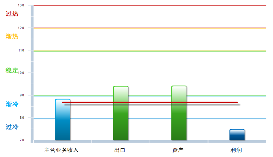 从分项指数看,除资产景气度外其他三项分项指数均有较明显回升,其中:主营业务收入景气指数88.376,位于“渐冷”区间,较上月上升1.39点;出口景气指数为94.13,位于“稳定”区间,较上月上升6.29点;资产景气指数为94.26,位于“稳定”区间,较上月下降0.27点;利润景气指数74.91,位于“过冷”区间,较上月回升2.86点。