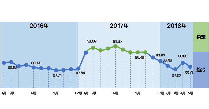 中国轻工业经济运行及预测预警系统数据显示:2018年开年,中轻景气指数延续去年四季度以来的下降态势,连续5个月在蓝色“趋冷”区间波动,5月中轻景气指数为88.21,环比4月下降0.59点。