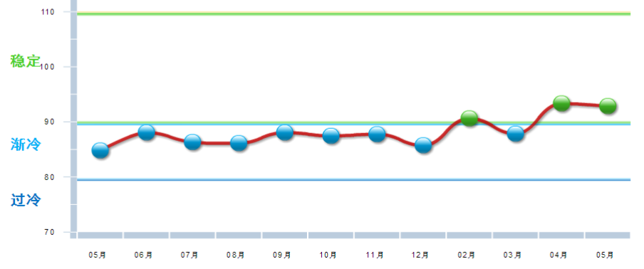 从分项指数环比变化看,主营业务收入、出口景气指数环比下降,利润、资产景气指数环比回升,其中:主营业务收入景气指数90.05,位于“稳定”区间,较上月下降0.69点;出口景气指数为110.19,位于“趋热”区间,较上月下降3.99点;资产景气指数为89.03,位于“渐冷”区间,较上月回升0.69点;利润景气指数100.95,位于“稳定”区间,较上月回升点。