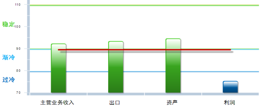 从分项指数环比变化看,出口、利润景气指数环比有较大幅度上升,主营业务收入和资产景气指数环比小幅回落,其中:主营业务收入景气指数92.31,位于“稳定”区间,较上月下降0.96点;出口景气指数为93.42,位于“稳定”区间,较上月下降2.11点;资产景气指数为94.63,位于“稳定”区间,较上月下降0.99;利润景气指数75.36,位于“过冷”区间,较上月回升0.07点。