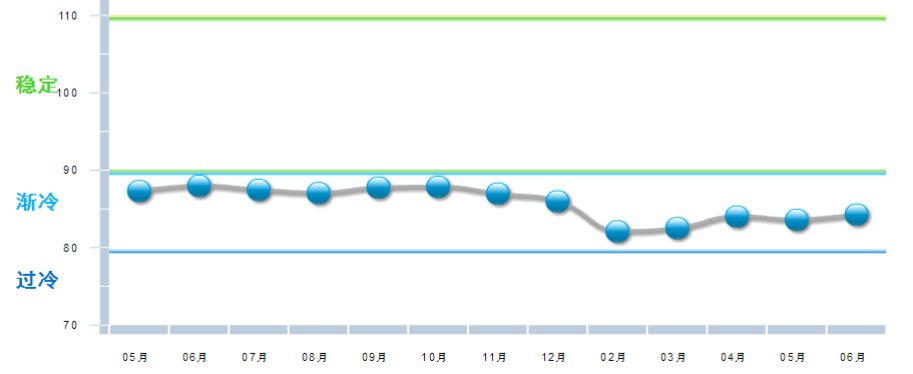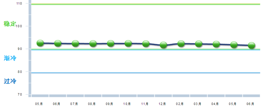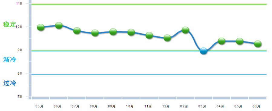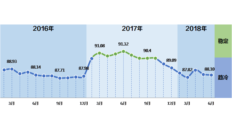 中国轻工业经济运行及预测预警系统数据显示:2018年开年,中轻景气指数延续去年四季度以来的下降态势,连续6个月在蓝色“趋冷”区间波动,6月中轻景气指数为88.10,环比5月下降0.11点。