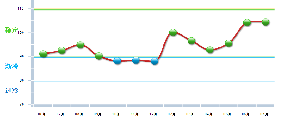 据中国轻工业经济运行及预测预警系统数据显示,2018年7月中国乳品制造业景气指数为104.37,处在“稳定”区间,较6月回升0.23点。