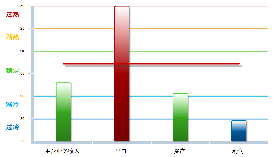 四项分项指数中,利润、资产景气指数环比下降,主营业务收入、出口景气指数环比上升,其中:主营业务收入景气指数96.02,位于“稳定”区间,较上月回升0.15点;出口景气指数为274.55,位于“过热”区间,较上月回升8.76点;资产景气指数为91.36,位于“稳定”区间,较上月下降0.09点;利润景气指数79.30,位于“过冷”区间,较上月下降2.13点。