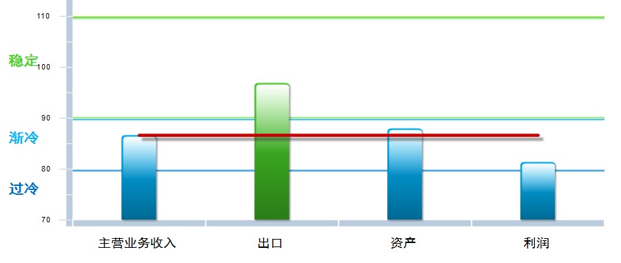 除出口景气指数外,其他三项分类指数环比上月均有下降,其中:主营业务收入景气指数86.69,位于“渐冷”区间,较上月下降0.24点;出口景气指数为96.94,位于“稳定”区间,较上月上升3.85点;资产景气指数为88.01,位于“渐冷”区间,较上月下降0.25点;利润景气指数81.42,位于“渐冷”区间,较上月下降0.17点。