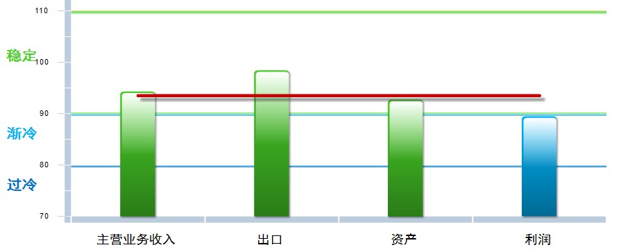 分项指数中,主营业务收入和资产景气指数环比下降,出口和利润景气指数环比上月回升,其中:主营业务收入景气指数94.34,位于“稳定”区间,较上月下降1.18点;出口景气指数为98.46,位于“稳定”区间,较上月上升1.1点;资产景气指数为92.78,位于“稳定”区间,较上月下降0.3点;利润景气指数89.49,位于“渐冷”区间,较上月回升1.24点。