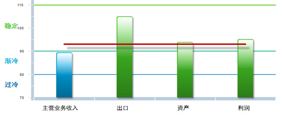 四项分项指数环比均有下降,出口景气指数下降幅度较大,其中:主营业务收入景气指数89.47,位于“渐冷”区间,较上月下降0.49点;出口景气指数为105.02,位于“稳定”区间,较上月下降34.35点;资产景气指数为93.95,位于“稳定”区间,较上月下降0.17点;利润景气指数95.19,位于“稳定”区间,较上月下降0.89点。
