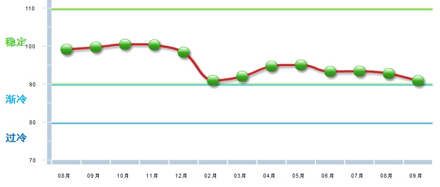分项指数中,出口景气指数环比回升,其他三项指数环比均有下降,其中:主营业务收入景气指数91.90,位于“稳定”区间,较上月下降1.61点;出口景气指数为97.97,位于“稳定”区间,较上月上升0.98点;资产景气指数为90.76,位于“稳定”区间,较上月下降0.25点;利润景气指数84.49,位于“渐冷”区间,较上月下降5.18点。