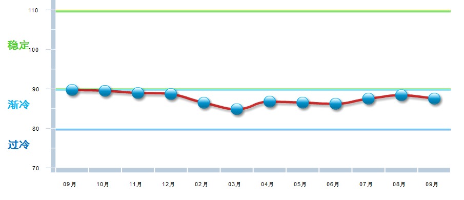 四项分项景气指数环比均有下降,其中:主营业务收入景气指数87.47,位于“渐冷”区间,较上月下降0.73点;出口景气指数为102.73,位于“稳定”区间,较上月下降1.06点;资产景气指数为92.95,位于“稳定”区间,较上月下降0.88点;利润景气指数78.11,位于“过冷”区间,较上月下降1.09点。