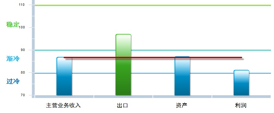 四项分项景气指数较上月均有下降,其中:主营业务收入景气指数86.96,位于“渐冷”区间,较上月下降0.16点;出口景气指数为97.09,位于“稳定”区间,较上月上升2.99点;资产景气指数为87.28,位于“渐冷”区间,较上月下降0.82点;利润景气指数81.22,位于“渐冷”区间,较上月下降0.83点。