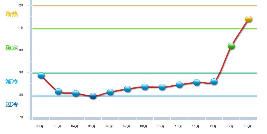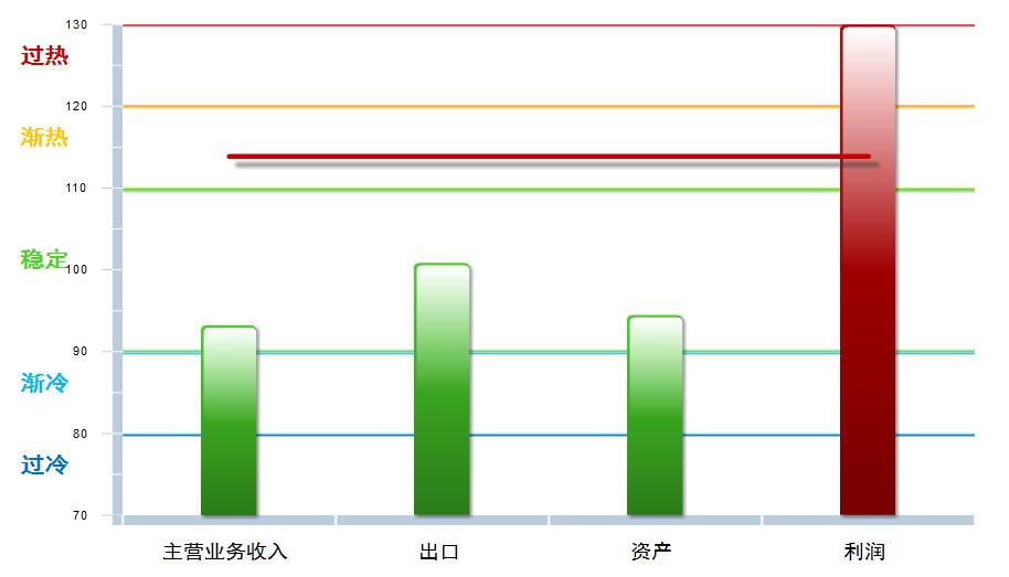 四项分项景气指数环比2月均有回升,利润指数回升幅度最大,其中:营业收入景气指数93.26,位于“稳定”区间,较2月回升1.88点;出口景气指数为100.85,位于“稳定”区间,较2月上升7.71点;资产景气指数为94.50,位于“稳定”区间,较2月回升0.52点;利润景气指数175.87,位于“过热”区间,较2月回升44.57点。