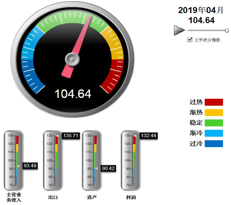四项分项景气指数环比3月均有下降,出口指数降幅较大,其中:营业收入景气指数93.49,位于“稳定”区间,较3月下降0.61点;出口景气指数为135.71,位于“过热”区间,较3月下降6.37点;资产景气指数为90.42,位于“稳定”区间,较3月下降0.77点;利润景气指数132.44,位于“过热”区间,较3月下降11.76点。