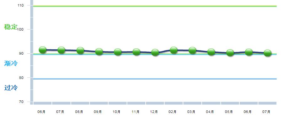 中国轻工业经济运行及预测预警系统数据显示:2019年,中轻景气指数继续在蓝色“趋冷”区间波动,7月中轻景气指数为87.11,较6月回升0.2点,较去年同月下降1.13点。