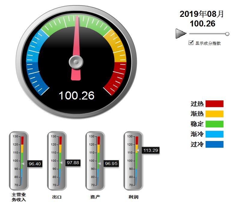 分项指数中,营业收入、资产景气指数环比回升,出口、利润景气指数环比下降:营业收入景气指数96.40,位于“稳定”区间,较7月回升1.44点;出口景气指数为97.88,位于“稳定”区间,较7月下降38.69点;资产景气指数为96.95,位于“稳定”区间,较7月回升2.84点;利润景气指数113.29,位于“趋热”区间,较7月下降1.11点。
