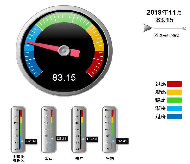 分项景气指数中,出口景气指数环比上月下降,营收、利润、资产景气指数环比回升,其中:营业收入景气指数82.04,位于“渐冷”区间,较10月回升0.54点;出口景气指数为86.34,位于“渐冷”区间,较10月下降2.22点;资产景气指数为85.49,位于“渐冷”区间,较10月回升1.0点;利润景气指数82.49,位于“渐冷”区间,较10月回升2.45点。