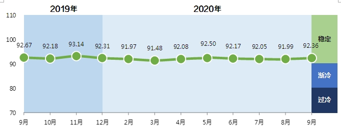 中国轻工业经济运行及预测预警系统数据显示:轻工大家居产业综合景气指数2020年呈触底回升走势。受新冠疫情影响,年初大幅下降至“过冷”区间;但随着轻工企业复工复产复市进度加快,该产业综合景气度3月以来持续回升,第三季度已回升至“渐冷”区间。2020年9月轻工大家居产业综合景气指数为82.32,较8月回升1.69点,较一季度末回升14.22点。