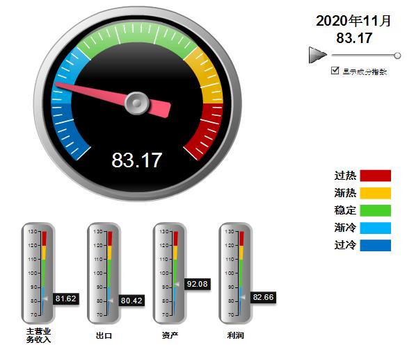 四项分项景气指数环比均下降。其中,利润、出口指数下降幅度较大。其中:营业收入景气指数81.62,位于“渐冷”区间,环比下降0.01点;出口景气指数为80.42,位于“渐冷”区间,环比下降6.2点;资产景气指数为92.08,位于“稳定”区间,环比下降0.9点;利润景气指数82.66,位于“渐冷”区间,环比下降3.11点。