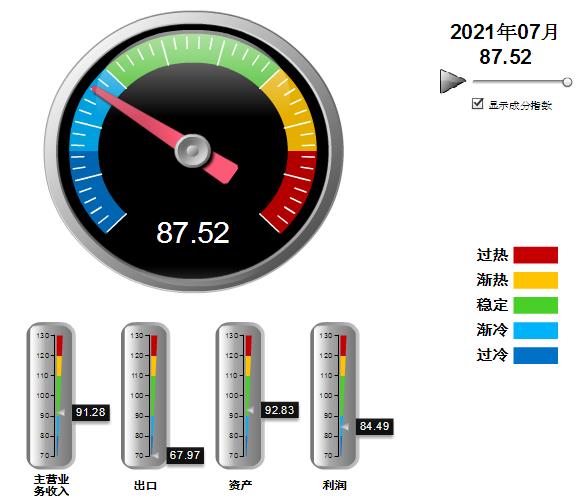 四项分项景气指数环比上月均有下降,利润指数降幅较大,其中:营业收入景气指数91.28,位于“稳定”区间,环比下降4.7点;出口景气指数为67.97,位于“过冷”区间,环比下降3.54点;资产景气指数为92.83,位于“稳定”区间,环比下降0.23点;利润景气指数84.49,位于“渐冷”区间,环比下降11.88点。