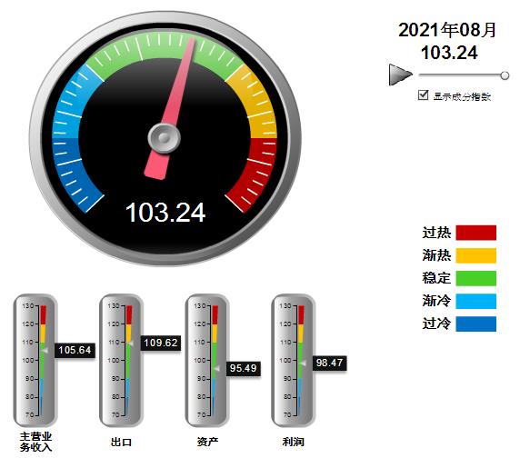 四项分项景气指数环比均有降,利润指数降幅较大,其中:营业收入景气指数105.64,位于“稳定”区间,环比下降1.73点;出口景气指数为109.62,位于“稳定”区间,环比下降1.7点;资产景气指数为95.49,位于“稳定”区间,环比下降0.42点;利润景气指数98.47,位于“稳定”区间,环比下降2.97点。