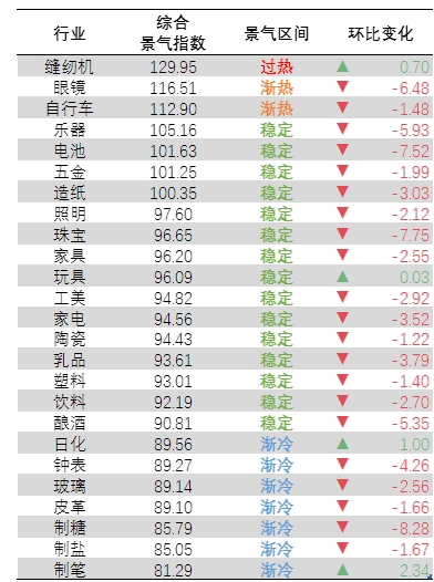 25个重点行业进行监测,缝纫机械行业景气度位于“过热”区间;自行车、眼镜行业位于“渐热”区间,占8%。乐器、电池、五金等15个行业位于“稳定”区间,占60%。日化、钟表、玻璃等7个位于“渐冷”区间,占28%。缝纫机、玩具、日化、制笔行业景气指数环比上升,其他行业下降。整体行业景气情况如下: