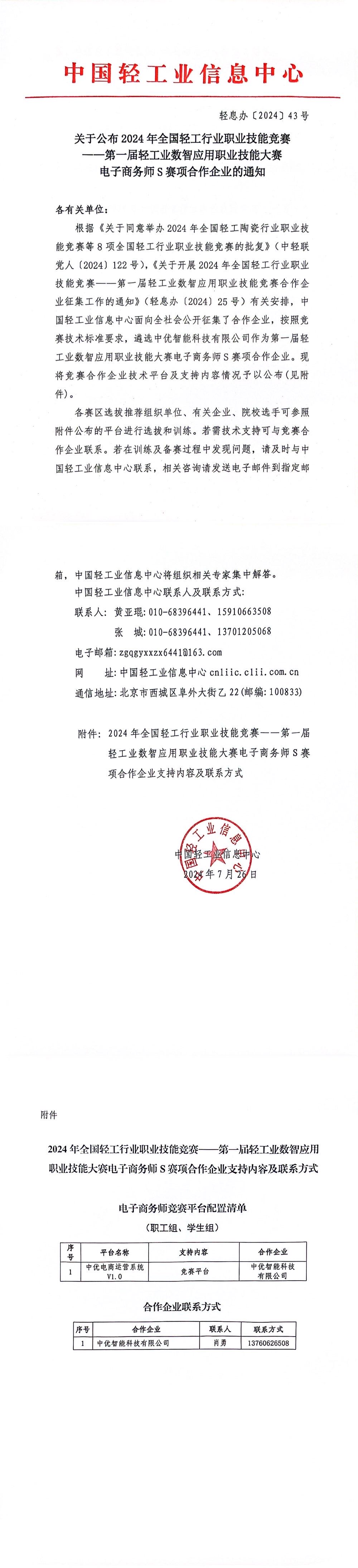 关于公布2024年全国 职业技能竞赛——第一届轻工业数智应用职业技能大赛电子商务师S赛项合作企业的通知