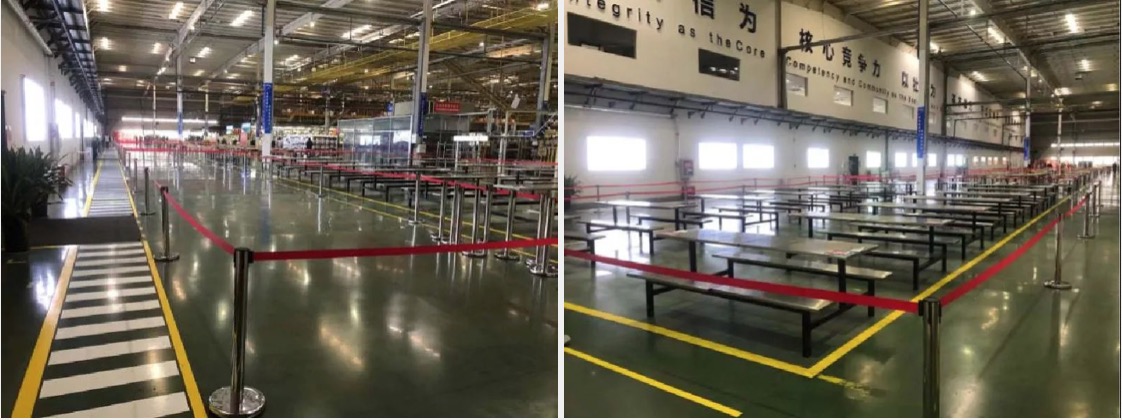 就餐采用“一个流”模式管控,排队时采用机场排队的隔离带,对就餐区域做了分离式指引,保证员工行迹路线不交叉。
