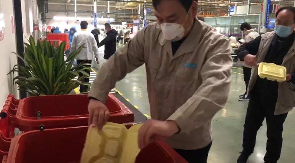 就餐后,餐盒会进行集中回收,统一处理;每一批员工就餐完毕,餐厅工作人员就会对就餐区域进行全面消毒。